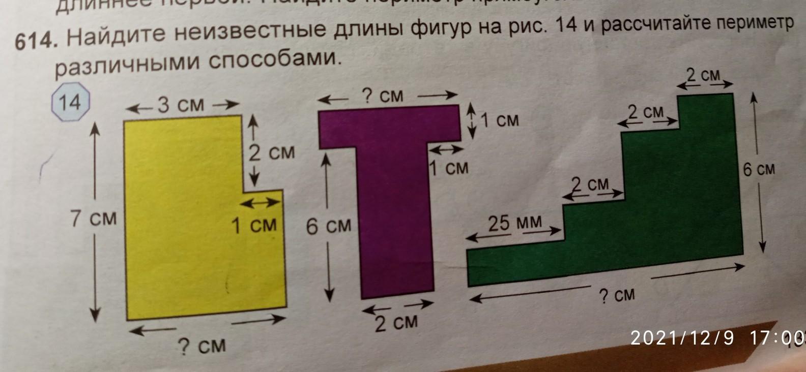 614. Найдите неизвестные длины фигур на рис. 14 и рассчитайте периметр различными способами. 14 3 см 7 см 2 см 1 см 2 см 2 см 1 см 7 см 2 см 6см 1 см 6см 25 мм 2 см ? см 133.