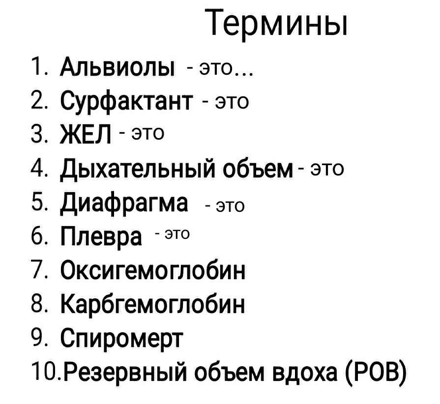 Резервный объем вдоха (Ровд) – максимальный объем воздуха, который можно дополнительно вдохнуть после спокойного вдоха. Резервный объем выдоха (РОвыд) – максимальный объем воздуха, который можно дополнительно выдохнуть после спокойного выдоха.