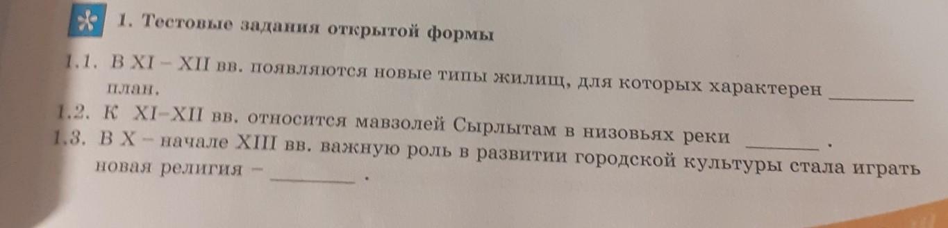 1. Тестовые задания открытой формы 1.1. В XI – XII вв. появляются новые типы жилищ, для которых характерен план. 1.2. кXI-XII вв. относится мавзолей Сырлытам в низовьях реки 1.3. BX - начале XIII вв. важную роль в развити городской культуры стала играть новая религия S