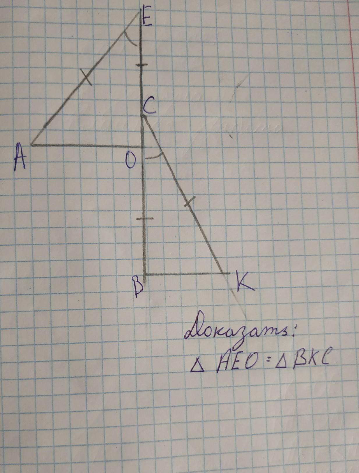 1)По данным рисунка ЕС=ОВ, тогда и ЕС+СО=ОВ+СО, т.е ЕО= СВ. 2)∆АЕО=∆КСВ (так правильнее,чем ∆AEO=∆BKC)по первому признаку: АЕ=КС(по данным рисунка) ,ЕО= СВ(из доказанного) и ∠АЕО=∠BKC(по данным рисунка.Ч.т.д.