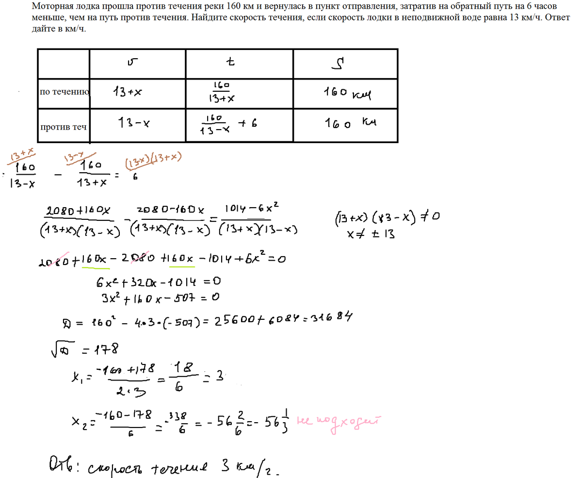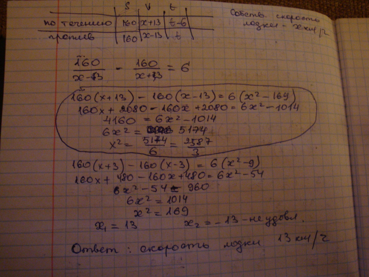 и вернулась в пункт отправления, затратив на обратный путь на 6 часов меньше, чем на путь против течения. Найдите скорость течения, если скорость лодки в неподвижной воде равна 13 км/ч. Ответ дайте в км/ч.