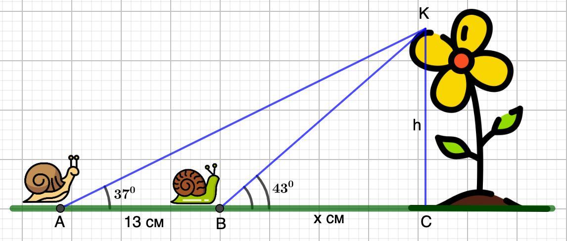 Определи высоту цветка, на который с земли смотрят две улитки, если первая улитка смотрит на него под углом 43°, вторая — 37°, а расстояние между улитками составляет 13 см. Вырази ответ в см.