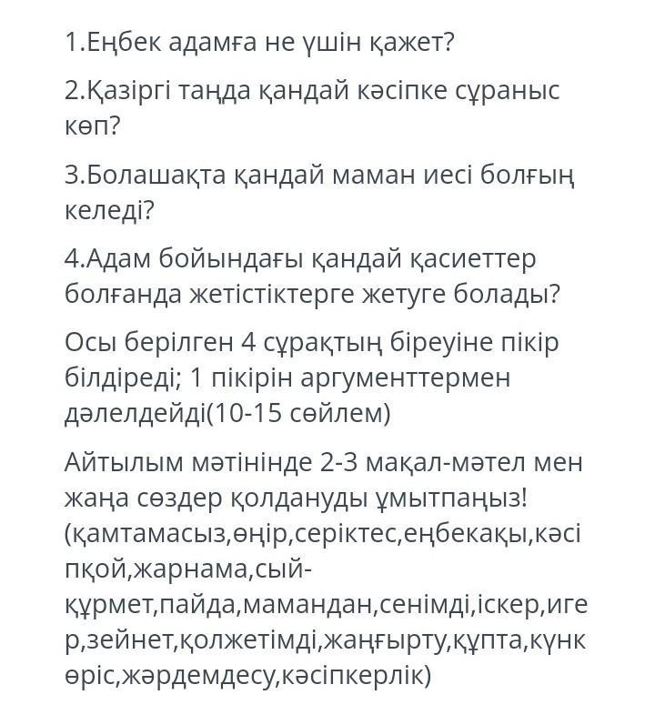 1.Еңбек адамға не үшін қажет? 2.Қазіргі таңда қандай кәсіпке сұраныс көп? 3.Болашақта қандай маман иесі болғың келеді? 4.Адам бойындағы қандай қасиеттер болғанда жетістіктерге жетуге болады? Осы берілген 4 сұрақтың біреуіне пікір білдіреді; 1 пікірін аргументтермен дәлелдейді(10-15 сөйлем) Айтылым мәтінінде 2-3 мақал-мәтел мен жаңа сөздер қолдануды ұмытпаңыз! (қамтамасыз,өңір,серіктес,еңбекақы,кәсі пқой,жарнама,сый- құрмет,пайда,мамандан,сенімді,іскер,иге р,зейнет,қолжетімді,жаңғырту,құпта,күнк өріс,жәрдемдесу,кәсіпкерлік