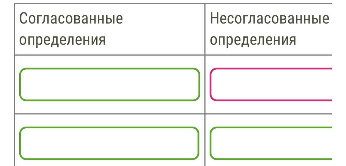 Выпиши из предложений и распредели в колонки определения. Слова записывай в той форме, в какой они даны в предложениях.