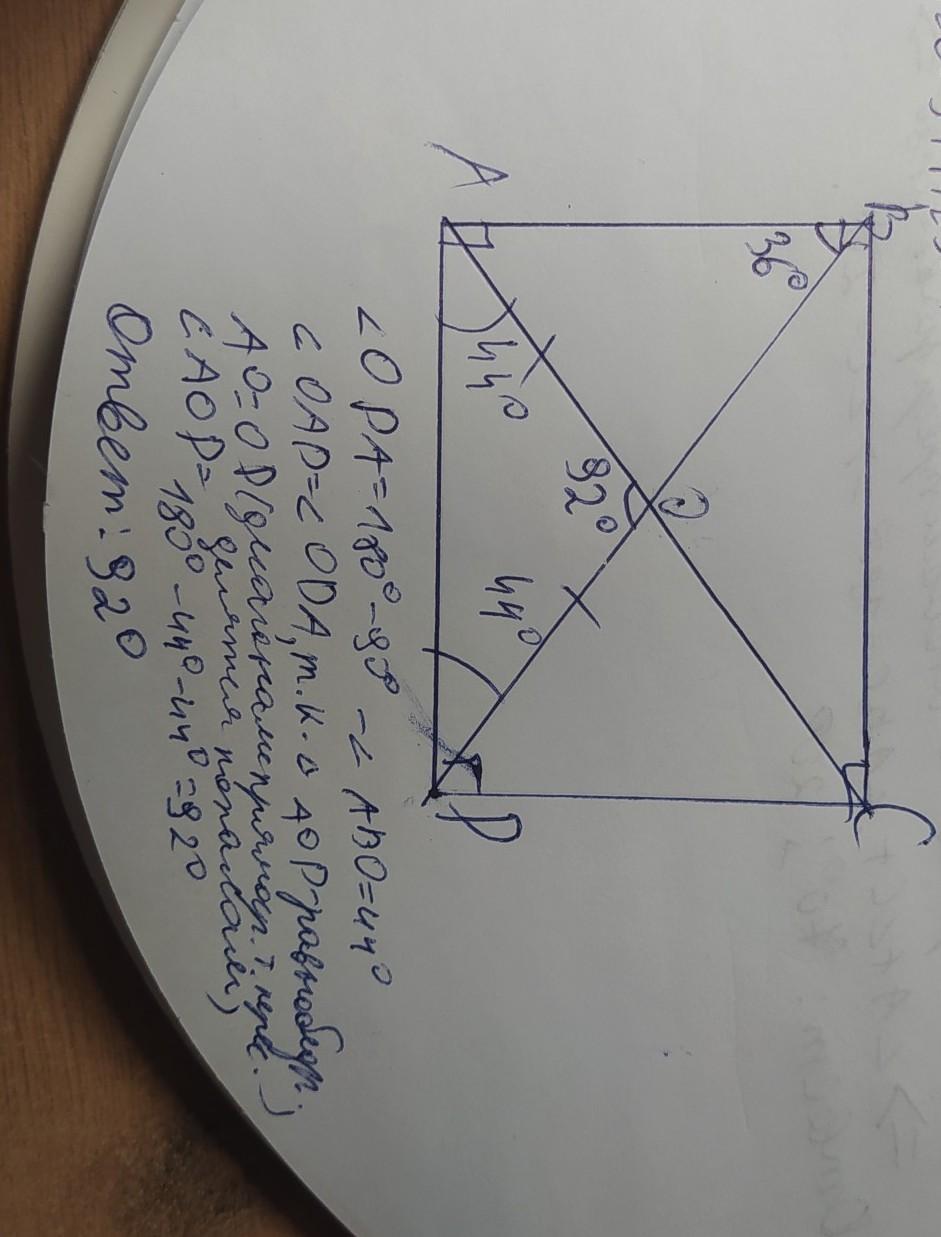 1. Диагонали прямоугольника ABCD пересекается в точке 0, ZABO = 36°. Найдите угол AOD. 2. Найдите углы прямоугольной трапеции, если один из ее Углов равен 20°.