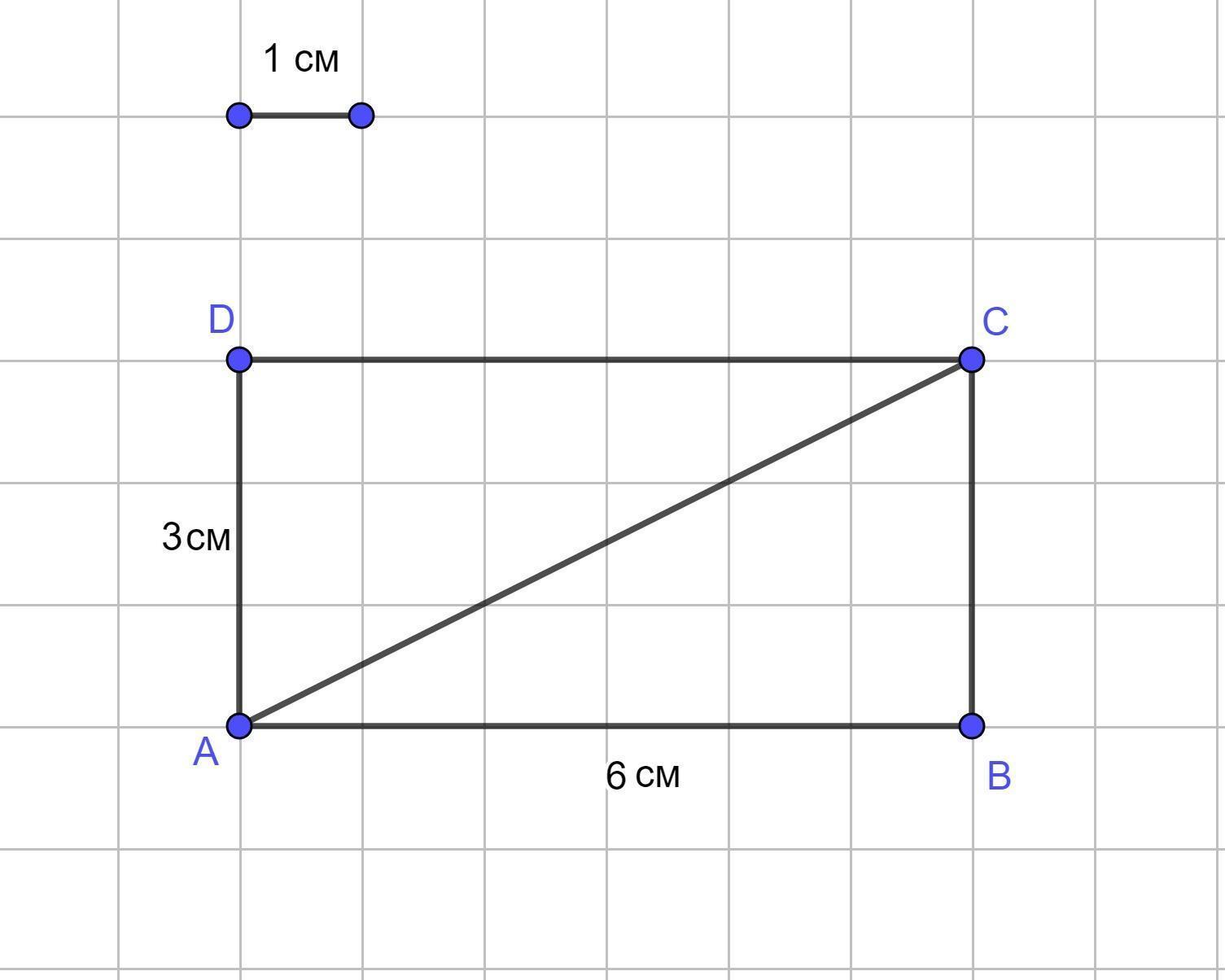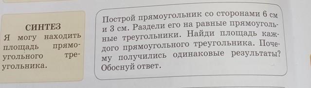 Построй прямоугольник со сторонами 6 см и 3 см. Раздели его на равные прямоуголь- ные треугольники. Найди площадь каж- дого прямоугольного треугольника. Поче- му получились одинаковые результаты? Обоснуй ответ.