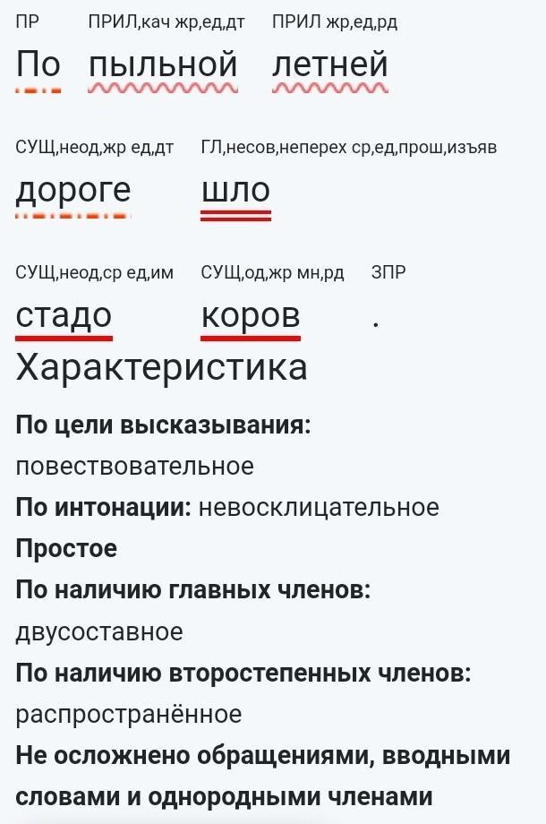 Пыльной,летней-определение,волнистой линией.Шло-подчёркиваем двумя полосами,сказуемое.Стадо чего?Коров,дополнение,подчёркивается _ _ _.Стадо,подлежащее,подчёркиваем линией.Шло где?По дороге,обстоятельство,подчёркиваем _ . _ . _ . _ .