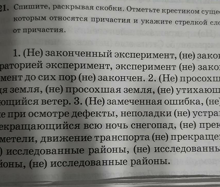 121. Спишите, раскрывая скобки. Отметьте крестиком существительные, к которым относятся причастия и укажите стрелкой слова, зависимые от причастия. 1. (Не) законченный эксперимент, (не) законченный ла бораторией эксперимент, эксперимент (не) закончен, экспе римент до сих пор (не) закончен. 2. (Не) просохшая после до ждя земля, (не) просохшая земля, (не) утихающий, а усили вающийся ветер. 3. (Не) замеченная ошибка, (не) обнаружен ные при осмотре дефекты, неполадки (не) устранены. 4. (Не) прекращающийся всю ночь снегопад, (не) прекращающие ся метели, движение транспорта (не) прекращено. 5. Совсем (не) исследованные районы, (не) исследованные геологами районы, (не) исследованные районы.