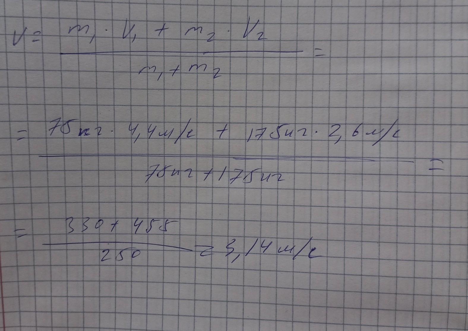 Цирковой акробат массой 75 кг, бегущий со скоростью 4,4 м/с, догоняет лошадь массой 175 кг, движущуюся со скоростью 2,6 м/с, и вскакивает на неё. Определи скорость лошади в тот момент, когда акробат вскочил на неё.