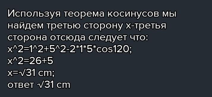 Вычисли третью сторону треугольника, если две его стороны соответственно равны 3 см и 8 см, а угол между ними равен 120°. Ответ: третья сторона равна −−−−−−√