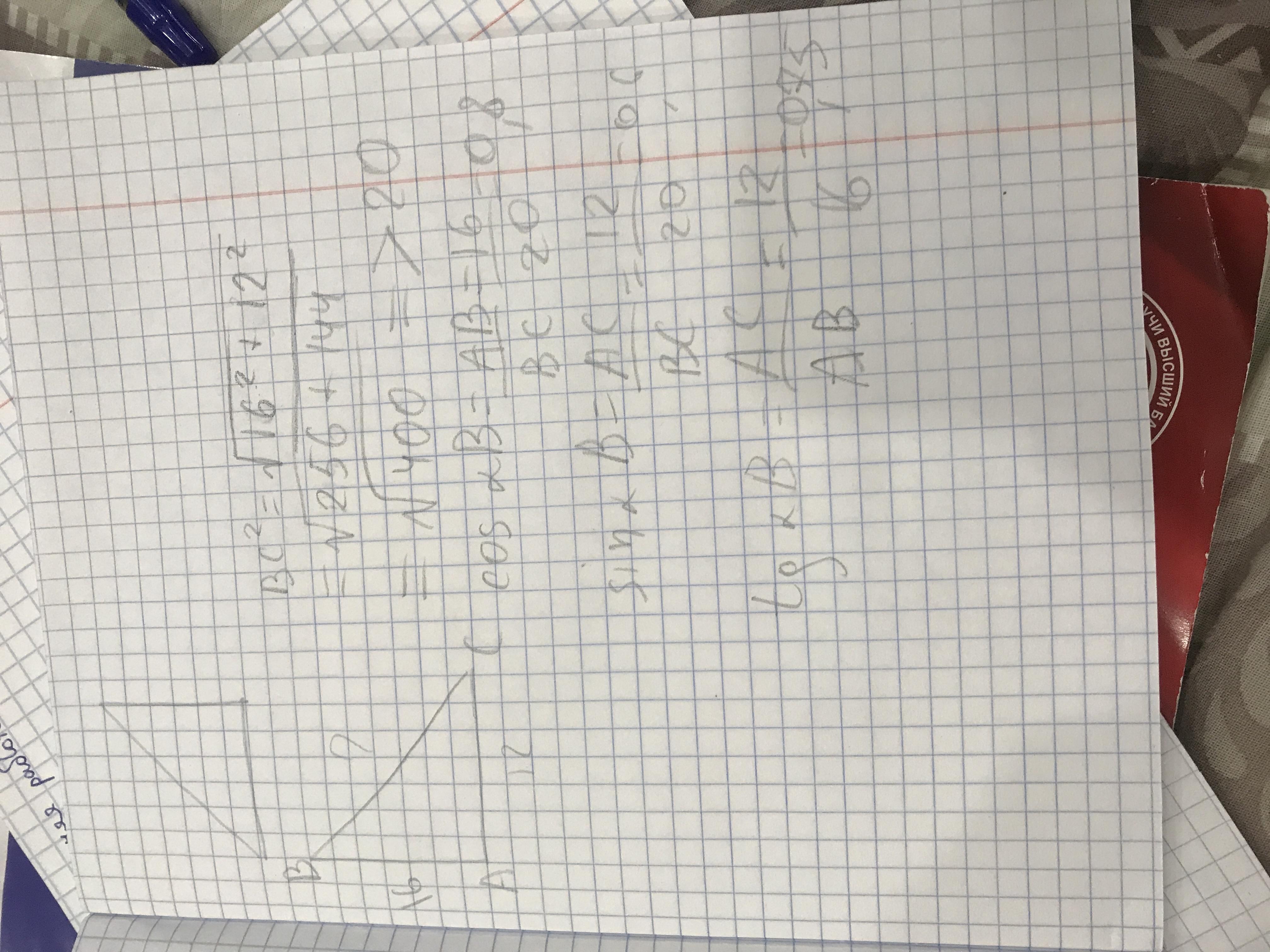 прямоугольном треугольнике ABC угол C прямой, катеты равны 12см и 16см. найдите косинус, синус и тагненс угла B