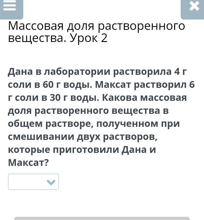 Дана в лаборатории растворила 4 г соли в 60 г воды. Максат растворил 6 г соли в 30 г воды. Какова массовая доля растворенного вещества в общем растворе, полученном при смешивании двух растворов, которые приготовили Дана и Максат?