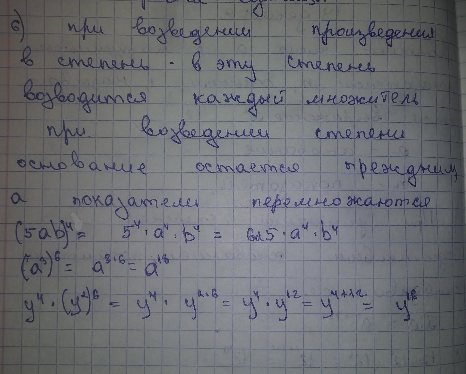 Сформулируйте правило возведения в степень степени.Представть в виде степени выражение:(5аб)^4;(а^3)^6;y^4•(y^2)^6.