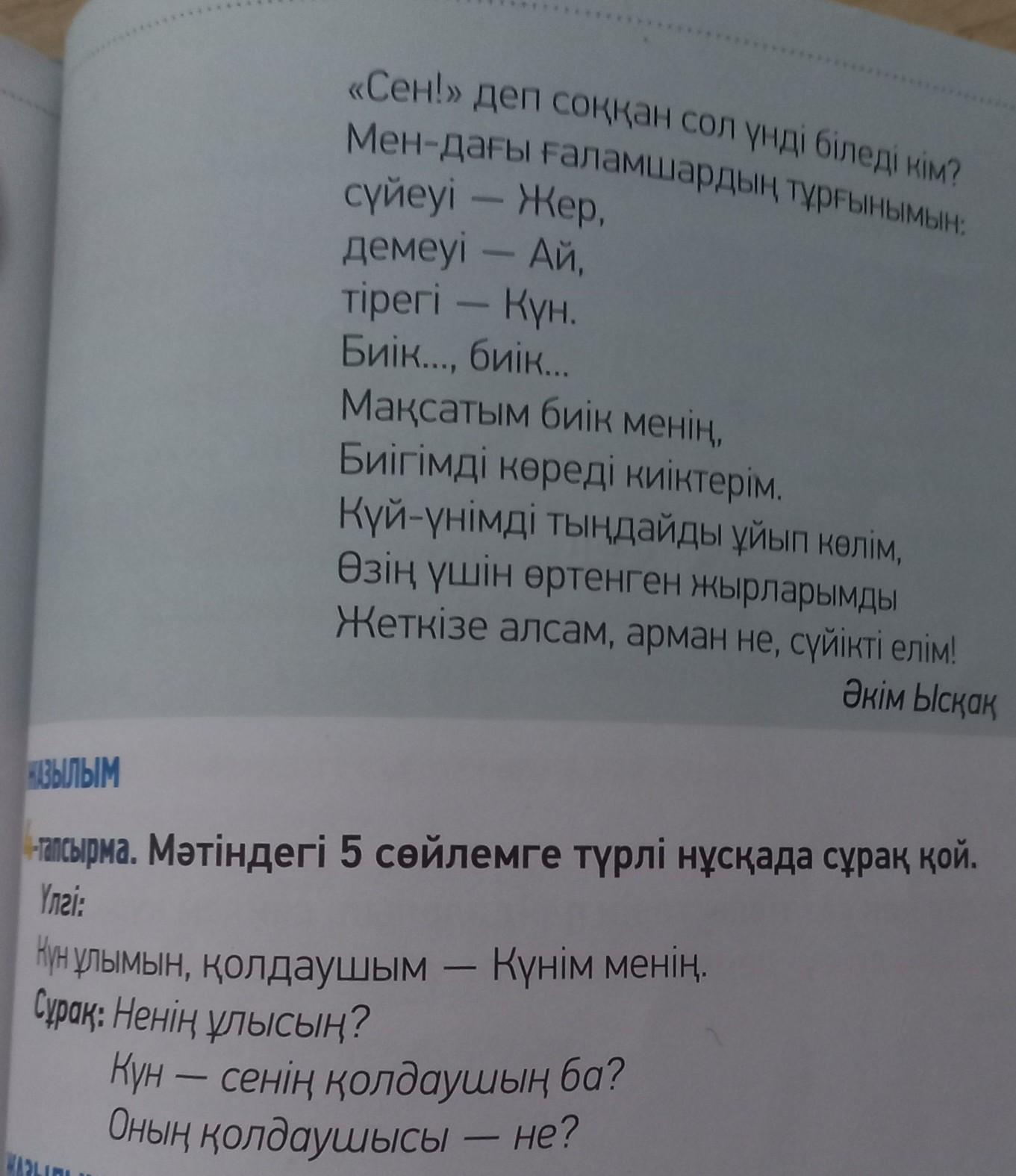 4-тапсырма Мәтіндегі 5 сөйлемге түрлі нұсқада сұрақ қой Үлгі: Күн ұлымын, қолдаушым - Күнім менің Сұрақ: Ненің ұлысың? Күн - сенің қолдаушың ба? Оның қолдаушысы - не?
