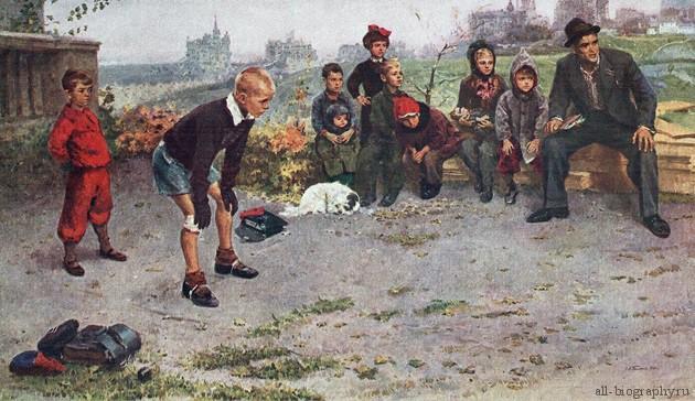 Привлекает фигура вратаря - она главная в сюжете картины. Напряженно стоя в импровизированных воротах, он внимательно следит за действиями нападающего, чтобы не пропустить гол. Обратите внимание на ноги вратаря. Он уже расшиб колено, и кто-то забинтовал ему рану. А обут вратарь в старые, подвязанные веревками, чтобы не спадали, сандалии. После войны купить новую одежду и обувь было очень непросто, поэтому он и брюки снял, чтобы не порвать и не испачкать.