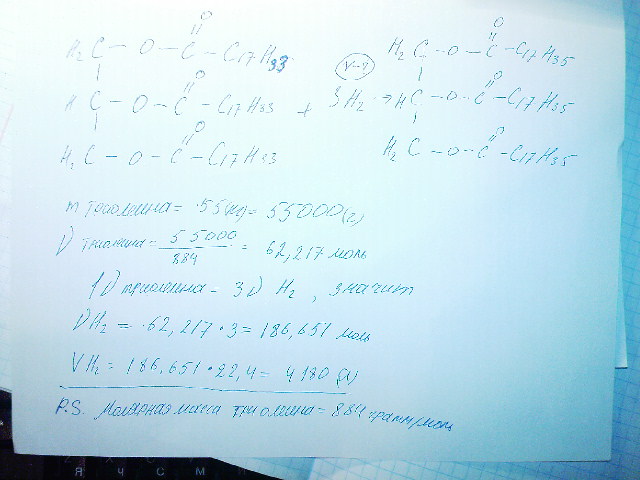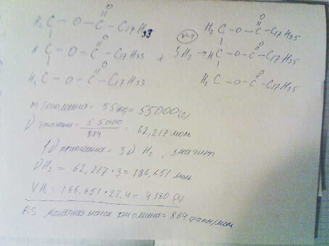 Какой объем водорода (н.у) необходим для превращения 55 кг триолеина в тристеарин?