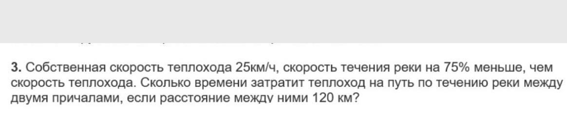 Но вот загвоздка... Мы знаем скорость теплохода (25км/ч), но не знаем скорость течения. Как быть? А вот тут нам пригодится информация о 75%. Сказано, что скорость течения на 75% меньше скорости теплохода. Что делать с этой инфой? Во-первых вспомним, что в данном случае собственная скорость теплохода - это 100%. То есть он плывёт с постоянной скоростью 100%) А вот скорость течения реки на 75% меньше, чем скорость теплохода. Если "на...меньше", то это минус) Стало быть, скорость течения равна 100%-75%=25% от скорости теплохода.