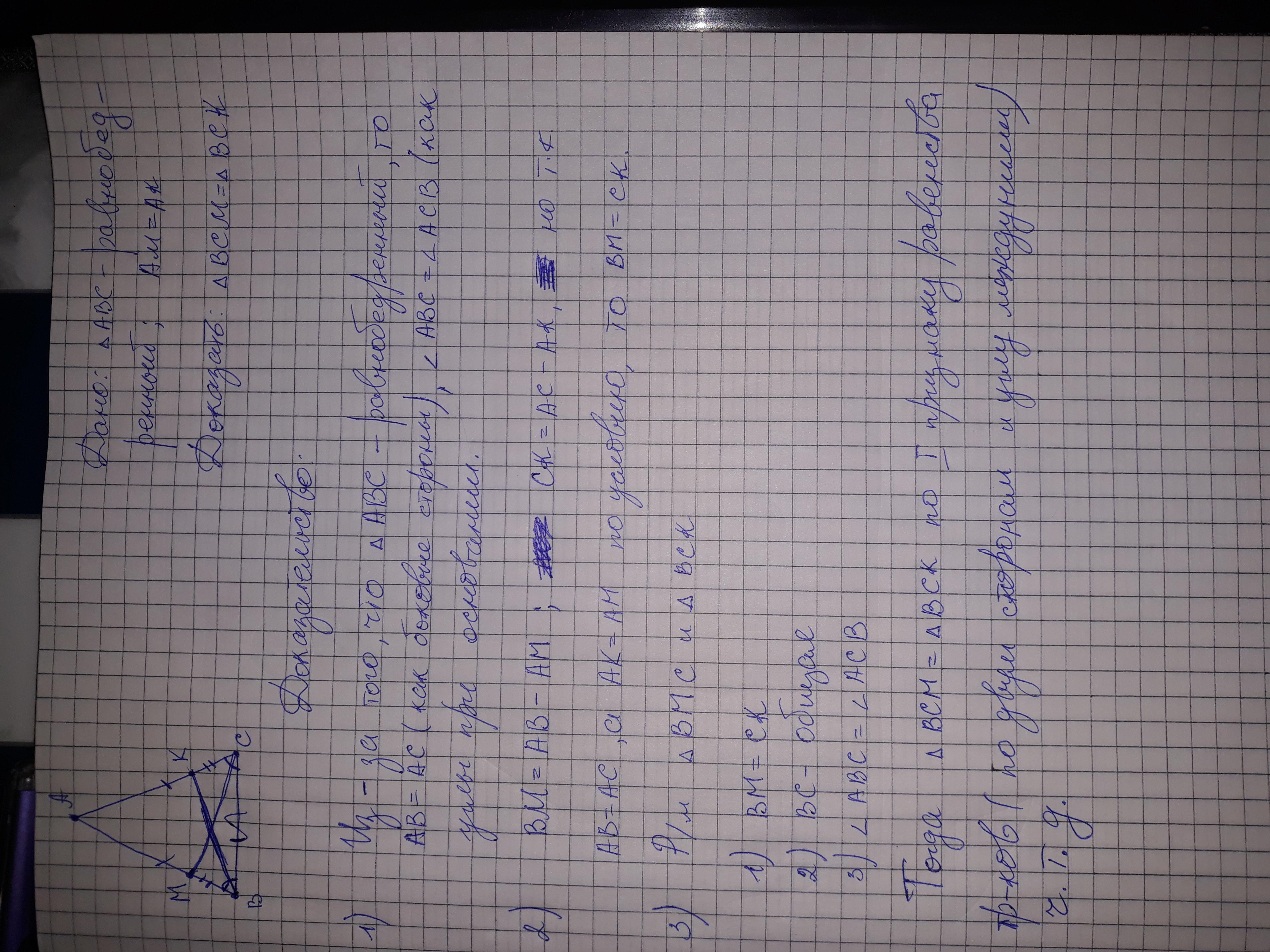 На боковых сторонах равнобедренного треугольника ABC отложены равные отрезки AMиAK докажите что треугольник BCM= треугольнику CBK Чертёж, решение, дано