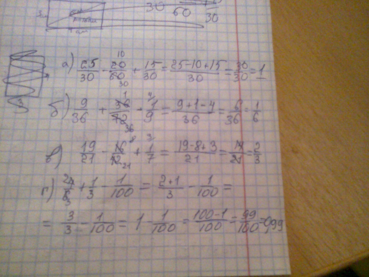 а) 25/30 - 20/60 + 15/30 б) 9/36+36/72-1/9 в) 19/21-16/42+1/7 г) 4/6+1/3-1/100 найди значения выражений . за ранее спс