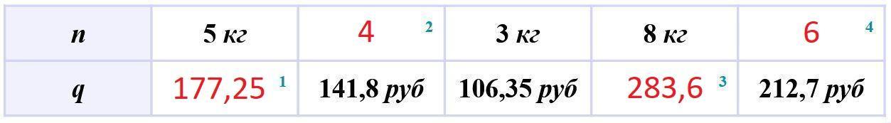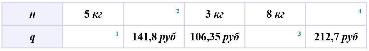 За n кг печенья заплатили q руб. По таблице найдите стоимость одного кг печенья и посчитайте значения пустых ячеек в таблице.