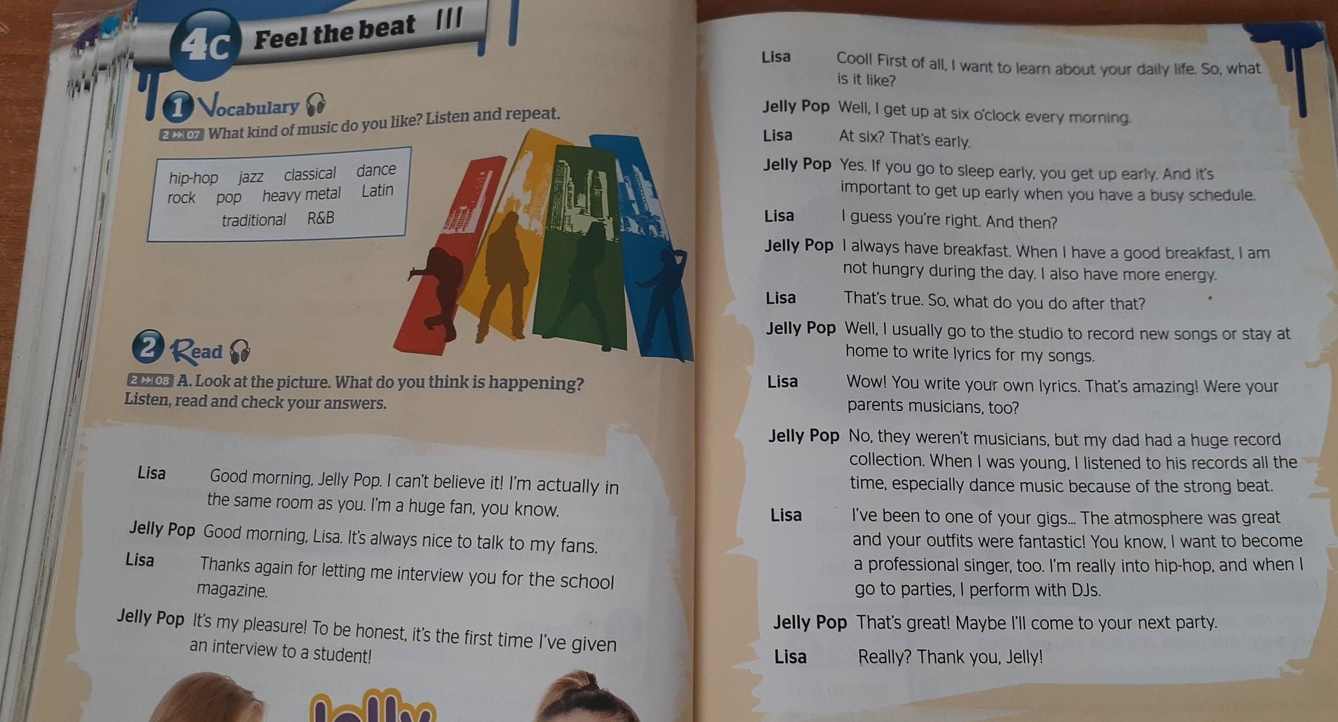B. Read again and answer the questions. 1. Where can you read Jelly's interview? 2. Why does Jelly go to bed early? 3. What does Jelly do after breakfast? 4. What did Lisa enjoy at Jelly's gig? 5. What is Lisa's favourite kind of music?