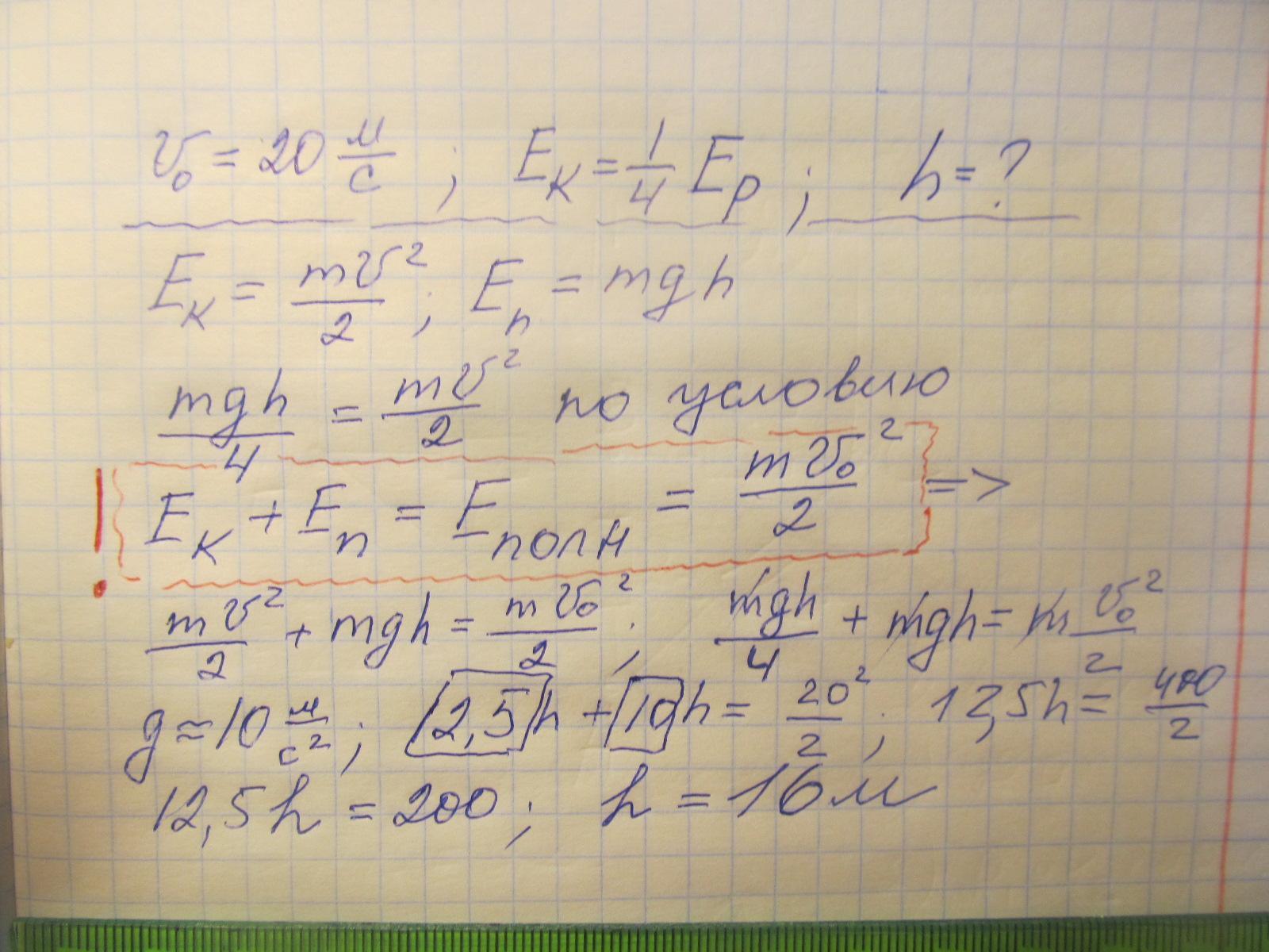 Мячик бросают вертикально вверх со скоростью 20 м/с. На какой высоте киистическая энергия составит 1/4 потенциальной энергии тела?