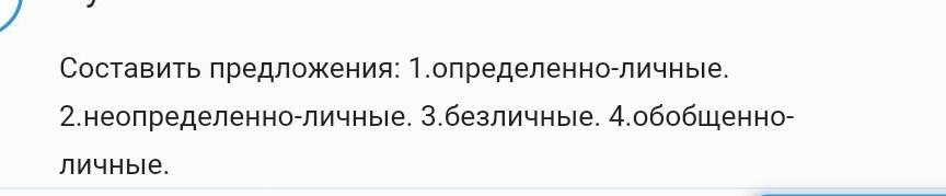- 1. Переведу часы, чтобы не опоздать на встречу. Думай хорошенько! Пойдемте в кино! Соберемся у костра, греемся, сушим одежду и поем под гитару. 2. Неопределённо-личные: Подайте книгу, пожалуйста. Вас вызывают к директору школы. На улице, как всегда, шумят. 3. Безличные: Необходимо узнать, что сегодня было интересного на репетиции.Сегодня необходимо завершить всю работу до конца! Об этом никак нельзя было говорить! Нельзя быть таким жестоким! 4. Обобщённо-личные предложения Блины пекут на молоке. Выходишь иногда на улицу и удивляешься прозрачности воздуха. Век живи — век учись.
