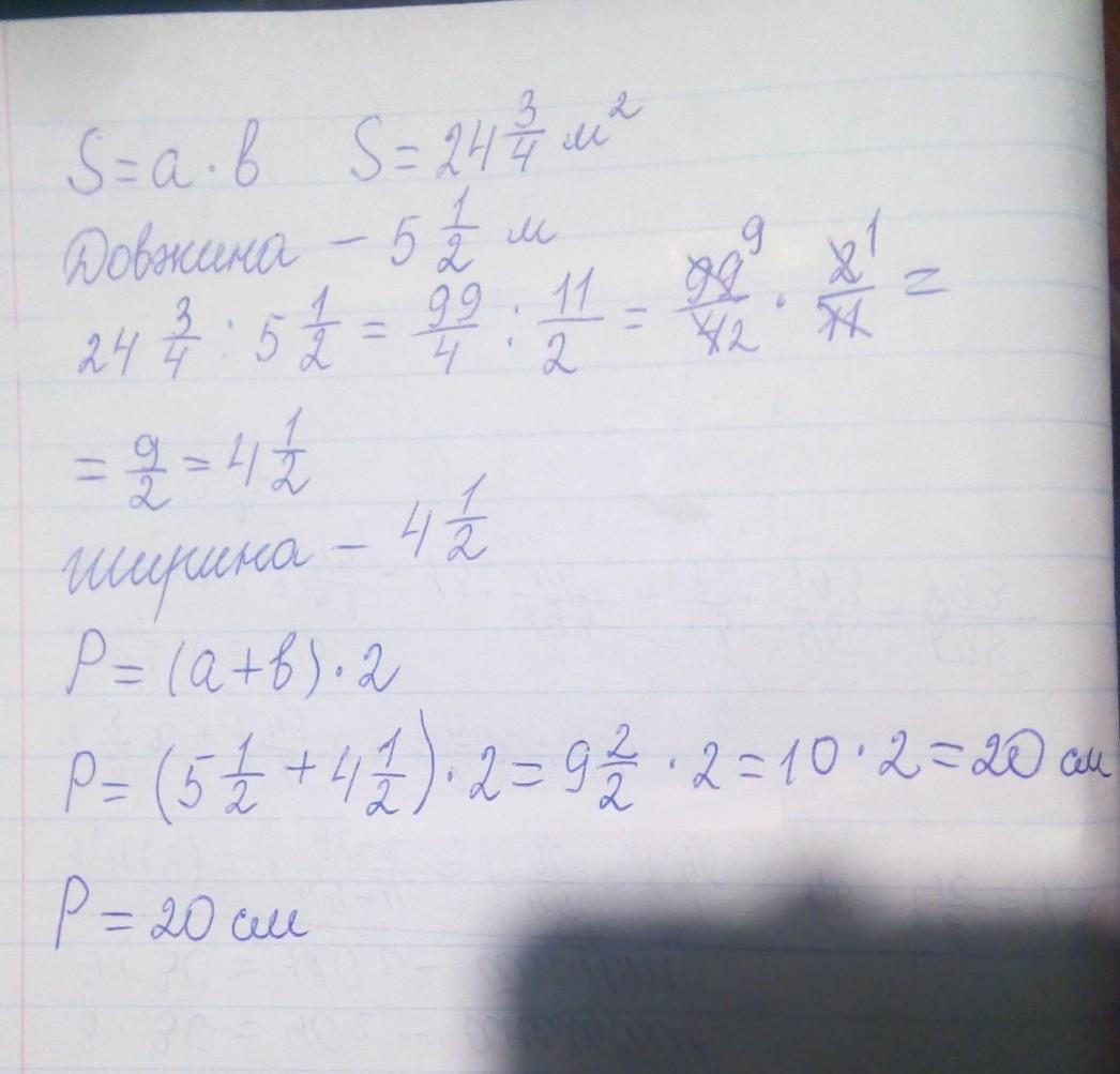 Знайди периметр підлоги прямокутної форми завдовжки 5 1/2 м, площа якої становить 24 3/4 ПОМОГИТЕ СРОЧНО