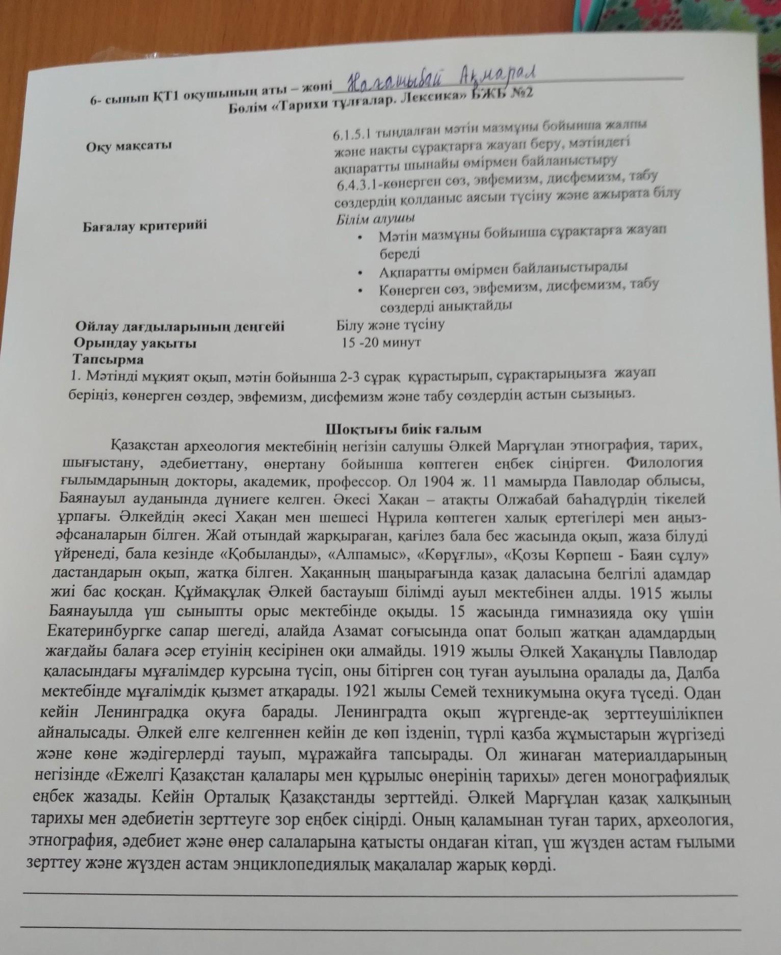 1. Мәтінді мұқият оқып, мәтін бойынша 2-3 сұрақ құрастырып, сұрақтарыңызға жауап беріңіз, көнерген сөздер, эвфемизм, дисфемизм және табу сөздердің астын сызыңыз.