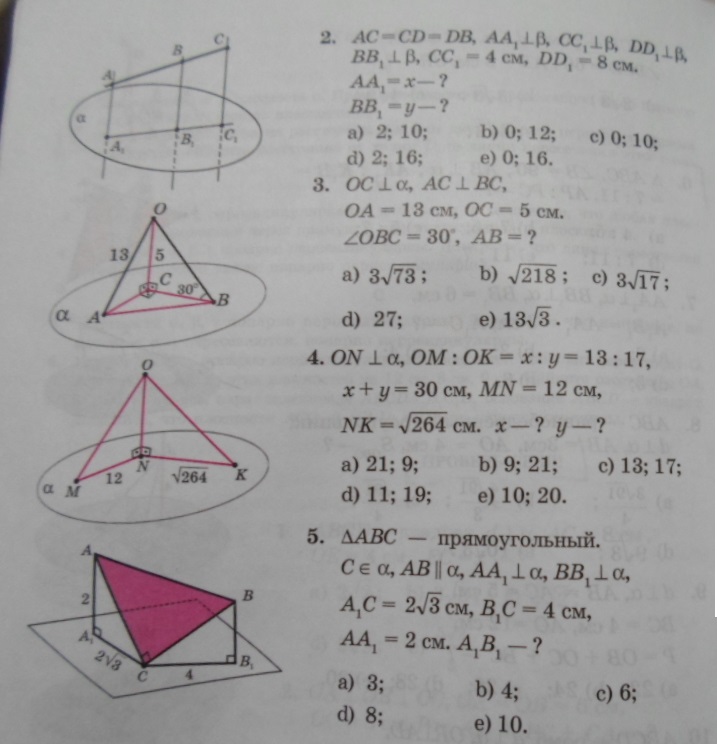 2) не понял где СД, ДВ -? 3)треугольник АОс прямоугольный, ОС=5 АО=13, АС=корень(АО в квадрате-ОС в квадрате)=корень(169-25)=12, треугольник ОСВ прямоугольный, ВС=ОС/tg30=5/(корень3/3)=5*корень3, треугольник АСВ прямоугольный, АВ=корень(АС в квадрате+ВС в квадрате)=корень(144+75)=корень219 (в ответе скорее всего опечатка) 4) ОМ/ОК=х/у=13/17, 13у=17х, у=17х/13, х+у=30, х+17х/30=30, 17х+13х=390, 390=30х, х=13=ОМ, у=30-13=17=ОК, проверяем на треугольниках, треугольник МОN прямоугольный, ОN=корень(ОМ в квадрате-МN в квадрате)=корень(169-144)=5, треугольник ОNК прямоугольный., ОN=корень(ОК в квадрате-NК вквадрате)=корень(286-264)=5, результаты сходятся, х=13, у=17, 6) А1В1 - лежит в плоскости а, АВ параллельна плоскости а, значит АВ параллельна А1В1, АА1 и ВВ1 перпендикуляры между двумя паралельными АА1=ВВ1=2, треугольник АА1С прямоугольный, АС=корень(АА1 в квадрате+А1С в квадрате)=корень(4+12)=4, треуголльник ВВ1С прямоугольный, ВС=корень(ВВ1 в квадрате+В1С в квадрате)=корень(4+16)=2*корень5, АА1ВВ1 прямоугольник АВ=А1В1, треугольник АСВ прямоугольный, уголС=90, АВ=корень(АС в квадрате+ВС в квадрате)=корень(16+20)=6=А1В1