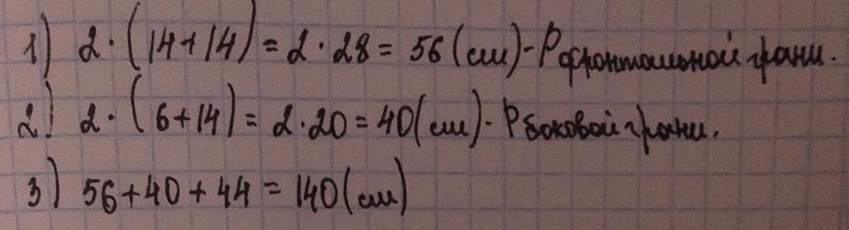 Длина двух сторон грани основания — 6 см и 14 см, длина бокового ребра коробки — 14 см.