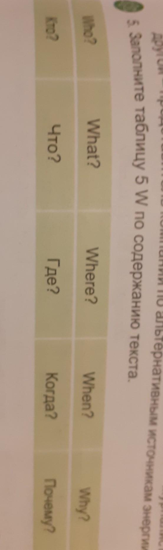 нергии 5. Заполните таблицу 5 W по содержанию текста. What? Where? Who? When? Why? Что? Кто? Где? Когда? Почему? Послетекстовая рабо