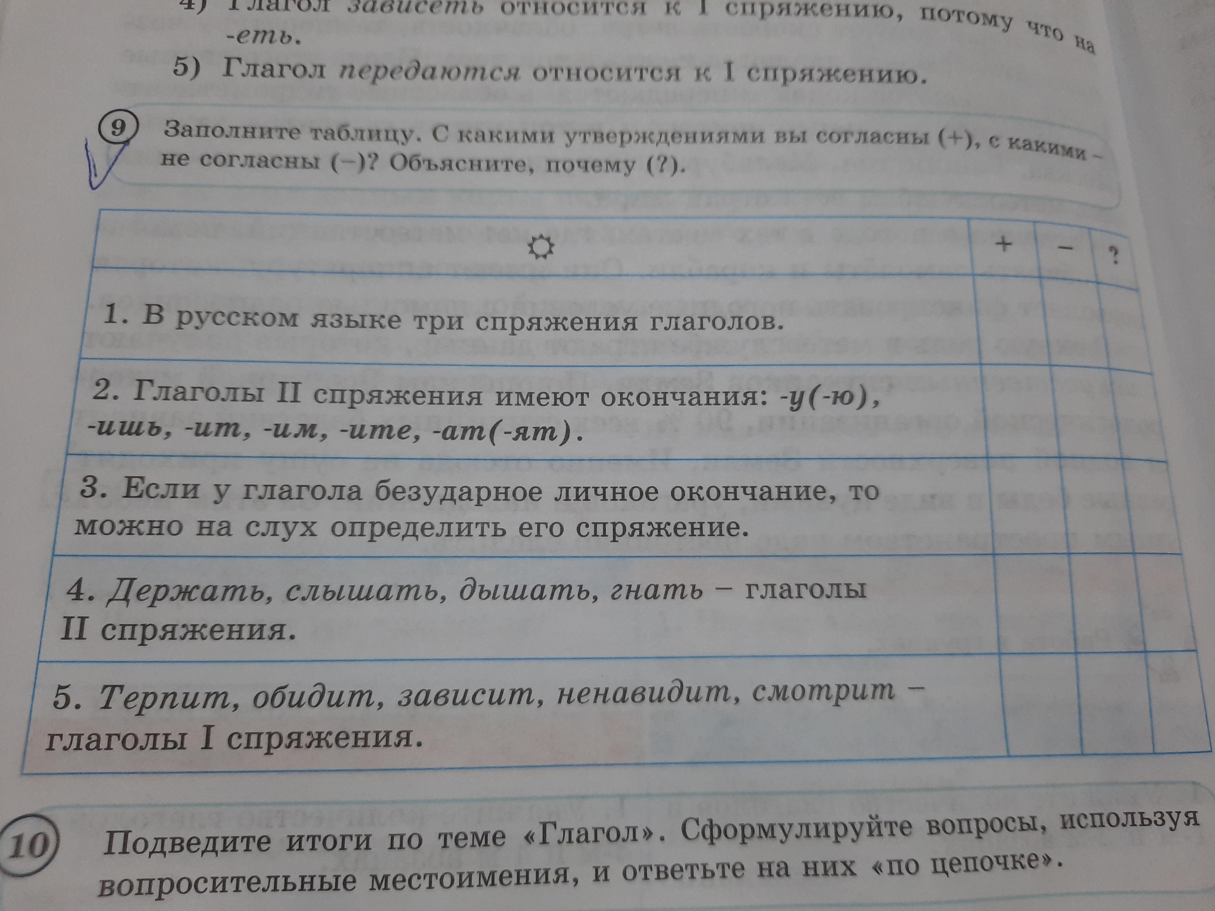 Заполните таблицу. С какими утверждениями вы согласны (+), с какими не согласны (—)? Объясните, почему (?). — 1. В русском языке три спряжения глаголов2.Глаголы 2 спряжения имеют окончания: -у(-ю),-ишь,-ит, -им, -ите, -ат (-ят)