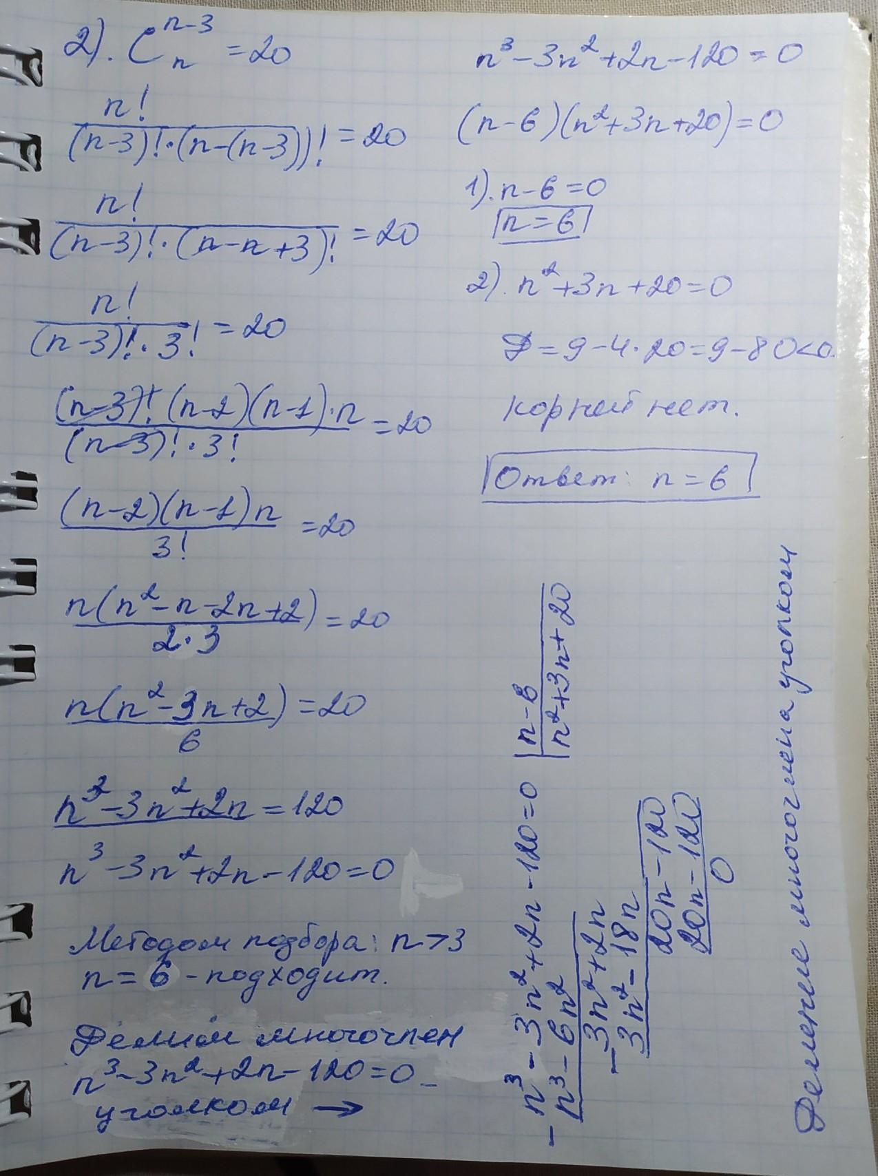 При делении уголком первый член n³ многочлена делимого n³–3n²+2n–120 делим на первый член n двучлена делителя n–6: (n³÷n=n²), потом умножаем частное n² на делитель n²(n–6)=n³–6n и записываем результат n³–6n под делимым и вычитаем n³–3n–(n–6n)=3n² и дописываем к результату +2n, получаем 3n²+2n. Делим первый член 3n² двучлена 3n²+2n на первый член n двучлена n–6, получаем 3n²÷n=3n. Умножаем: 3n×(n–6)=3n²–18n, записываем этот результат под 3n²+2n и вычитаем 3n²+2n–(3n²–18)=3n²+2n–3n²+18n=20n, дописываем –120, получаем 20n–120. Делим 20n на n, получаем 20. 20×(n–6)=20n–120, записываем под 20n–120, вычитаем, получим 0.