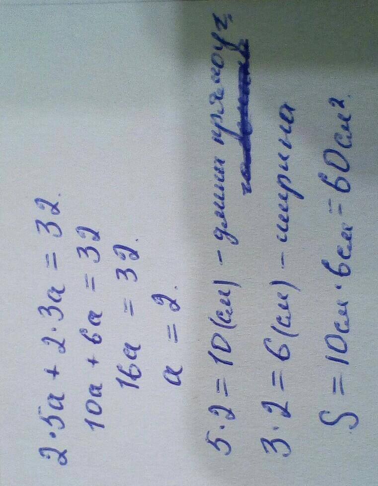 ОЧЕНЬ СРОЧНО!!Одна сторона прямоугольника равна 5а cm вторая -3a cm периметр прямоугольника равен 32cm. Найдите площадь этого прямоугольника.