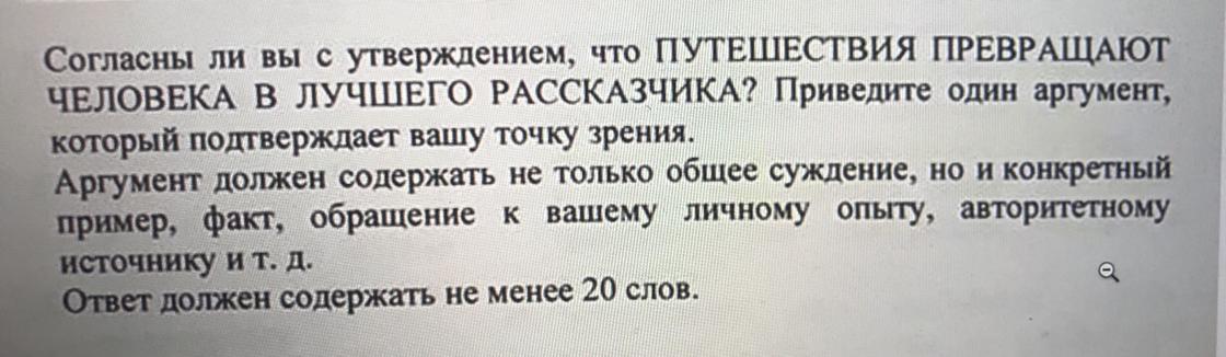 Согласны ли вы с утверждением, что ПУТЕШЕСТВИЯ ПРЕВРАЩАЮТ ЧЕЛОВЕКА В ЛУЧШЕГО РАССКАЗЧИКА? Приведите один аргумент, который подтверждает вашу точку зрения. Аргумент должен содержать не только общее суждение, но и конкретный пример, факт, обращение к вашему личному опыту, авторитетному источнику и т. д.