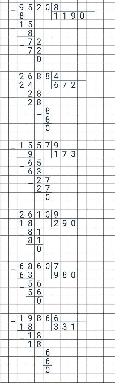 Выполни деление уголком. Не забывай определять количество цифр в частном: 9520 : 8, 2688 : 4, 1557 : 9, 2610 : 9, 6860 : 7, 1986 : 6