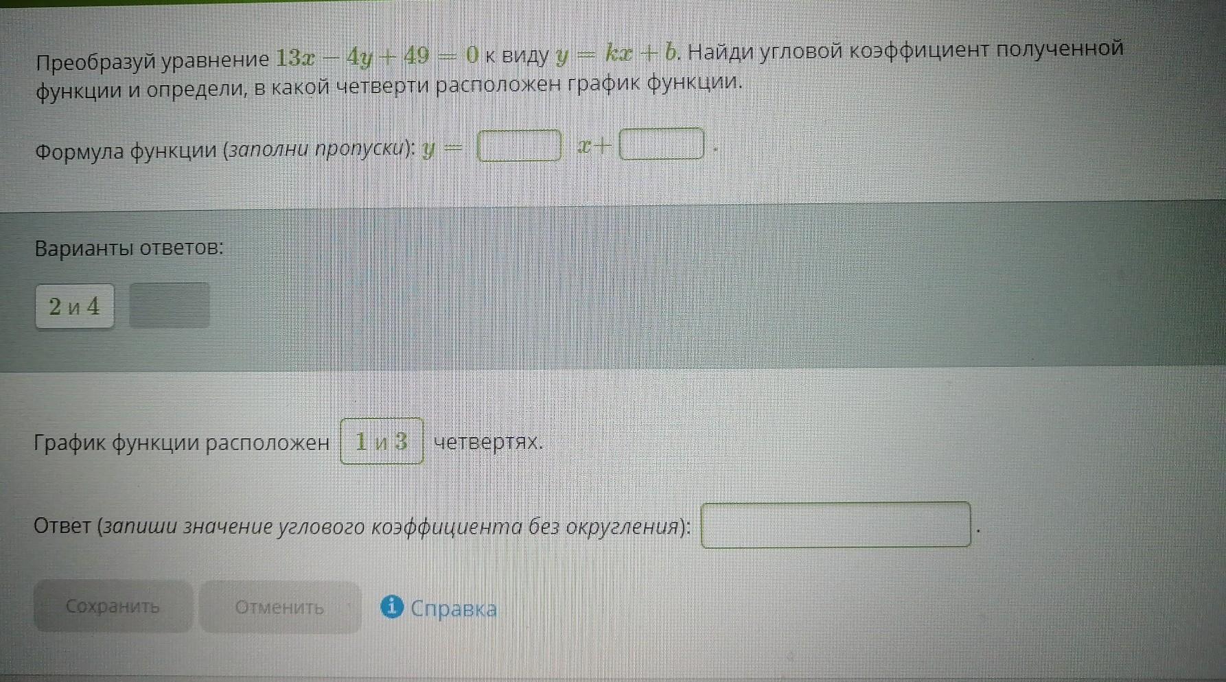 k= 3 1\4 у= 3 1\4х +12 1\4,график расположен в 1 и 3 четвертях(проходит через 2 четв.) схемат.график внизу
