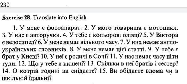 I have a camera. My friend have a bike.We have fountain pens.Do you have a colored pencils?Does Victor have a bicycle?I don't have a free time.They don't have english-Ukrainian vocabulary.I don't have this article. Do you have a brother in Khyiv?Does she have relatives in Sochi? We don't have time to go there.What do you have in your pocket?How many siblings does she have?what time do you have breakfast?Do you have lunch at home or in the school dining room?