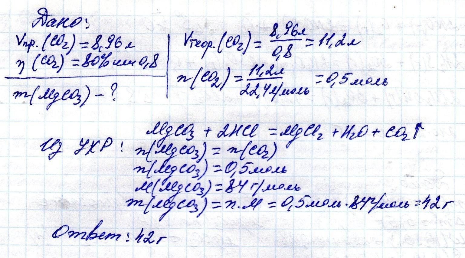из 42 г карбоната магния получено 8,96л углекислого газа н.у. рассчитайте выход продукта реакции