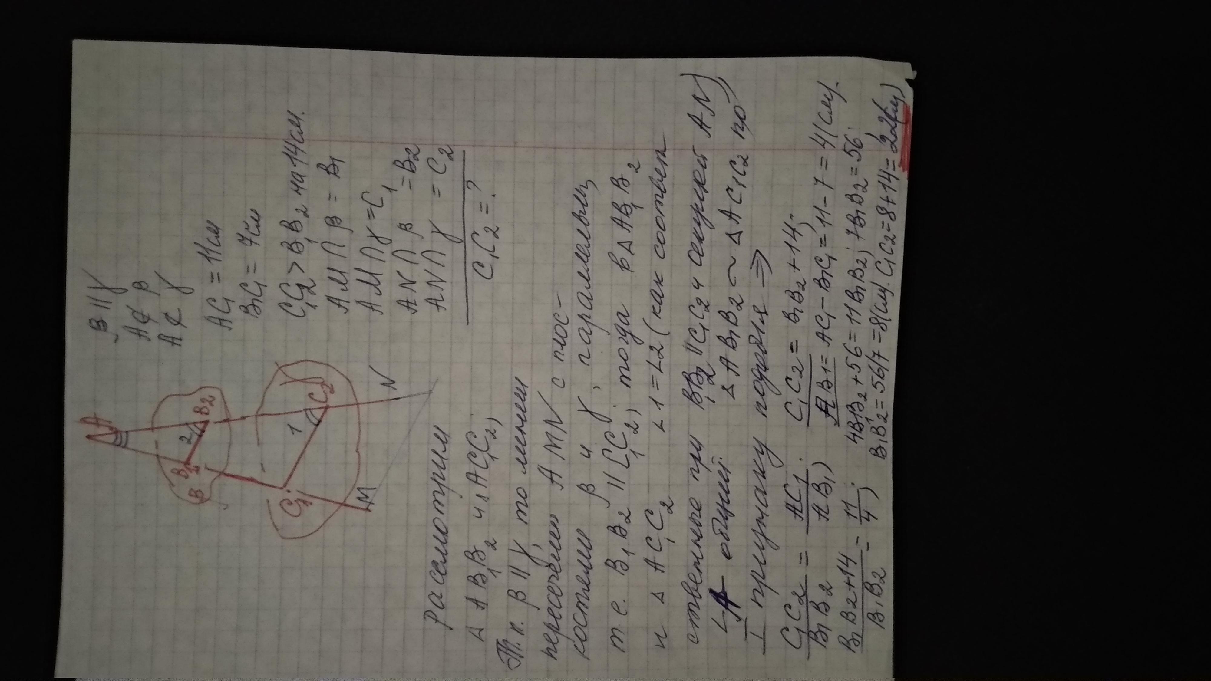 Плоскость β и γ параллельны . Из точки А , которая не принадлежит этим плоскостям и не находится между ними, проведены два луча. Один из них пересекает плоскости β и γ в точках В1 и С1, а другой – в точках В2 и С2 соответственно, АС1 = 11 см, В1С1 = 7 см. Найдите отрезок С1С2, если он на 14 см больше отрезка В1В2.