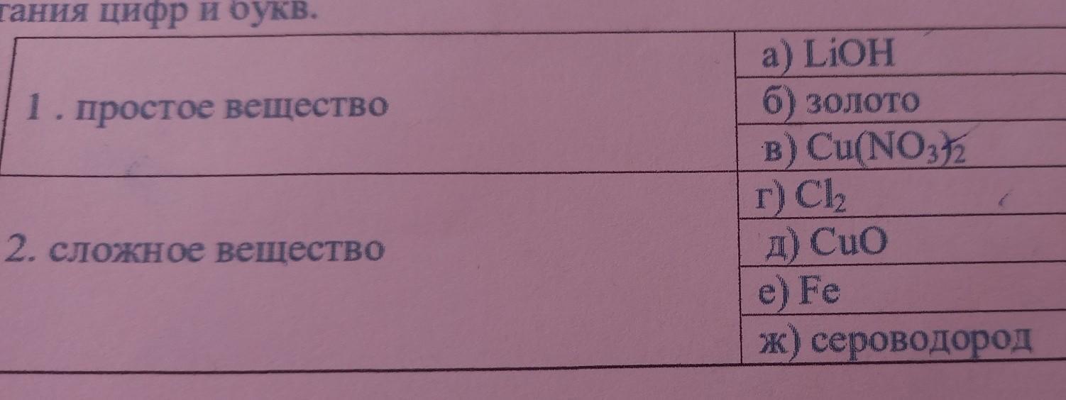 3.Установи соответствие между типом вещества и его формулой. Запиши ответ в виде сочетания цифр и букв. a) LiOH 1. простое вещество б) золото в) Cu(NO3), г) СІ, 2. сложное вещество е) Fe ж) сероводород д) CuO