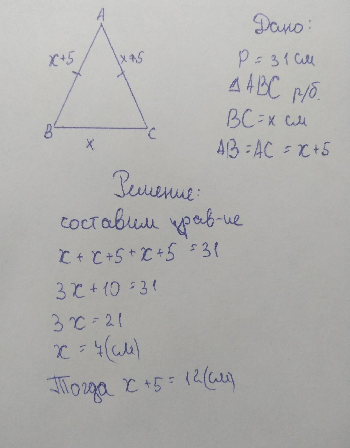 3. В равнобедренном треугольнике боковая сторона на 5 см больше основания.