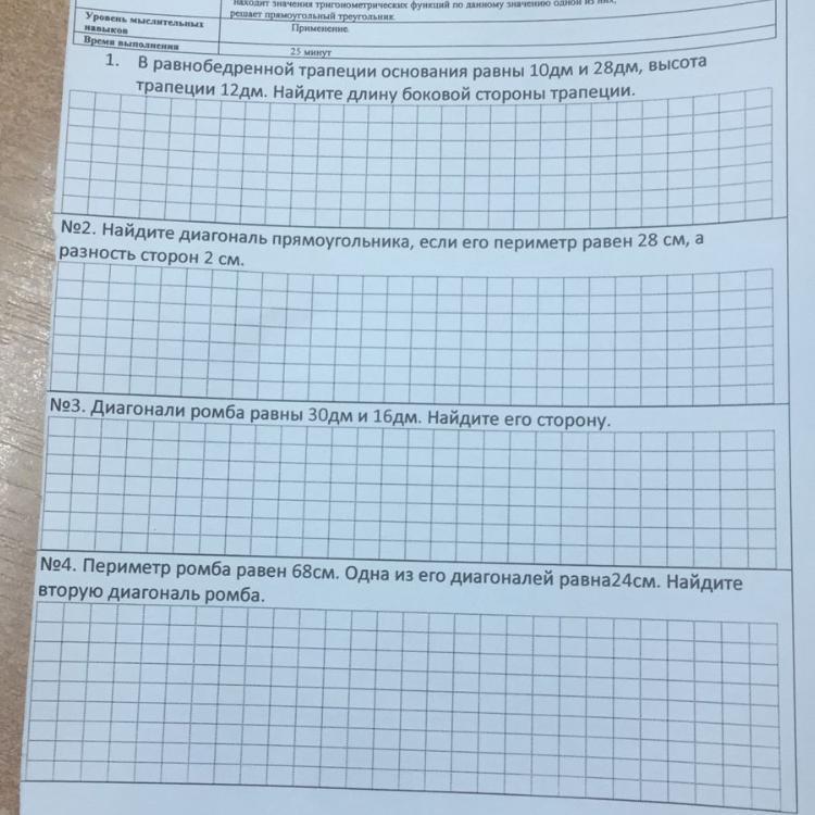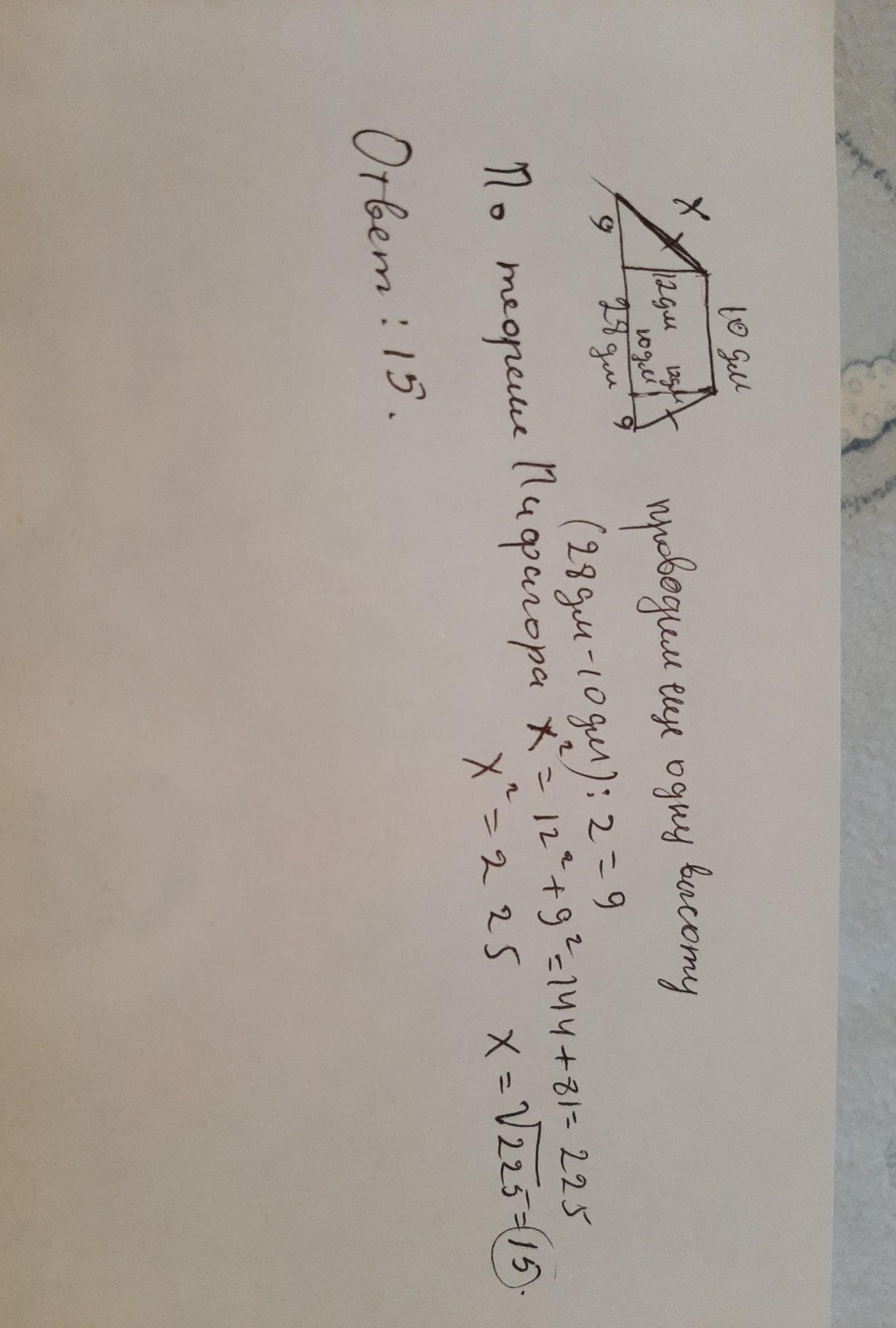 СОР ПО ГЕОМЕТРИИ В равнобедренной трапеции основания равны 10дм и 28дм,высота трапеции 12дм.Найдите длину боковой стороны трапеции.ПОМОГИТЕ СОР ПО ГЕОМЕТРИИ