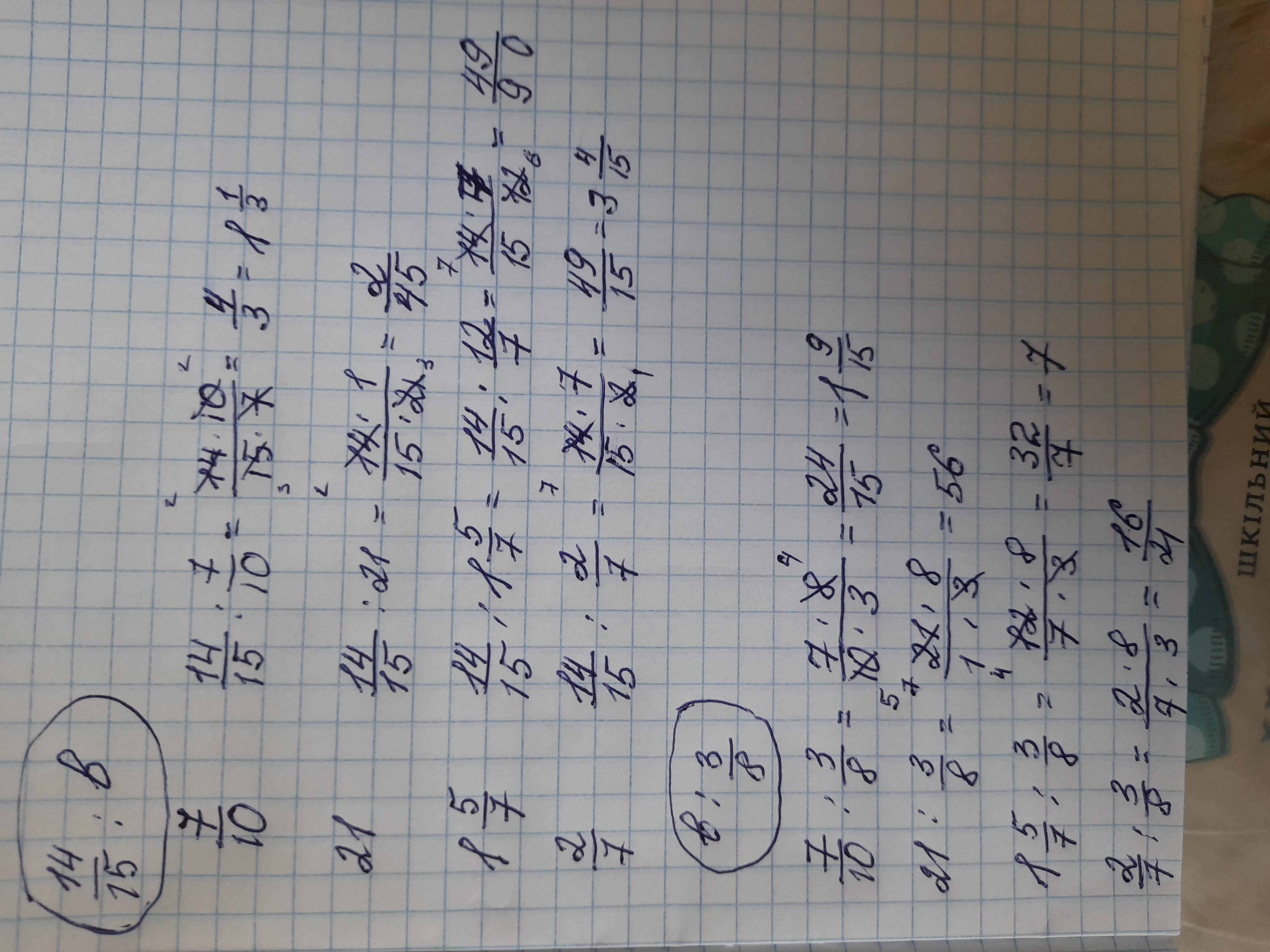 21 14/15:21 = (14*1)/(15*21)=2/30=1/15 21:3/8=(21*8)/3=56