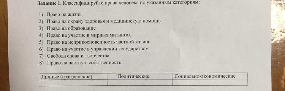 20БАЛЛООВ!!! Классифицируйте права человека по указанным категориям смотрите на фото