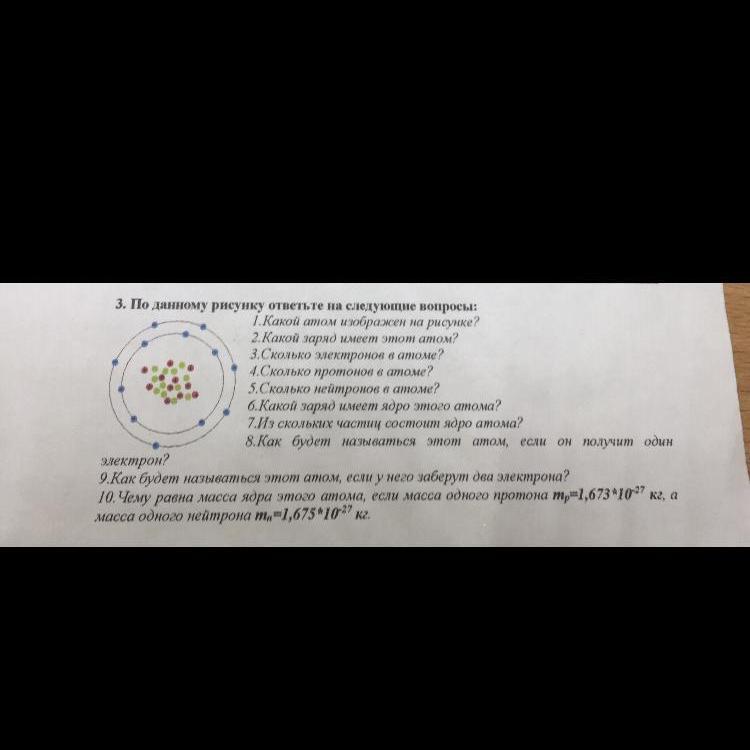 По данному рисунку ответьте на следующие вопросы: 1. Какой атом изображён на рисунке? 2. Какой заряд имеет этот атом? 3. Сколько электронов в атоме? 4. Сколько протонов в атоме? 5. Сколько нейтронов в атоме? 6. Какой заряд имеет ядро этого атома? 7. Из скольких частиц состоит ядро атома? 8. Как будет называться этот атом, если он получит один электрон? 9. Как будет называться этот атом, если у него заберут два электрона? ПОМОГИТЕ пожалуйста!!!!!!!!!!Даю 35 баллов!!!!!!!!!!!!!!!!!!!!!!!!!!!!С 10 вопросом тоже помогите пожалуйста!!!!!!!!!!!!!!!!!!!!!!!!!!!!!!!!!!!
