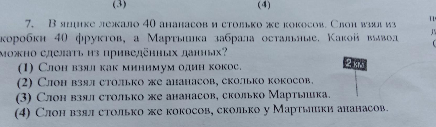 7. В ящике лежало 40 ананасов и столько же кокосов. Слон взял из коробки 40 фруктов, а Мартышка забрала остальные. Какой вывод можно сделать из приведённых данных? (1) Слон взял как минимум один кокос. (2) Слон взял столько же ананасов, сколько кокосов. (3) Слон взял столько же ананасов, сколько Мартышка. (4) Слон взял столько же кокосов, сколько у Мартышки ананасов. 2 км
