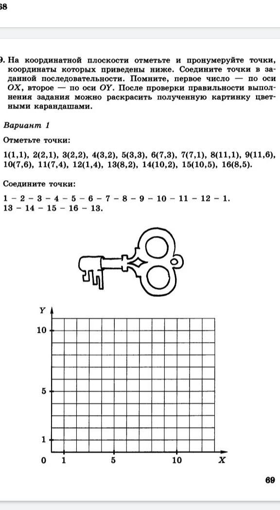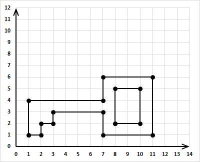 Отмечаем точки, соединяем их линиями (первая координата (1-я цифра в скобках) по оси х, вторая координата (2-я цифра в скобках) по оси у)