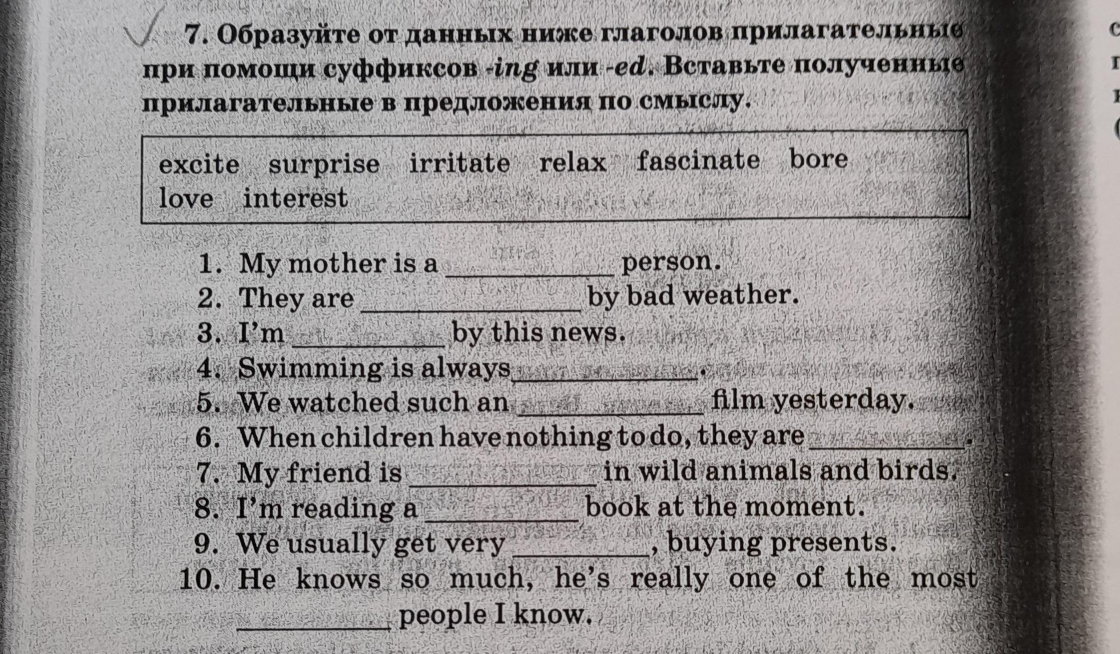 Образуйте от данных ниже глаголов прилагательные при помощи суффиксов -ing или -ed. Вставьте полученные прилагательные в предложения по смыслу.